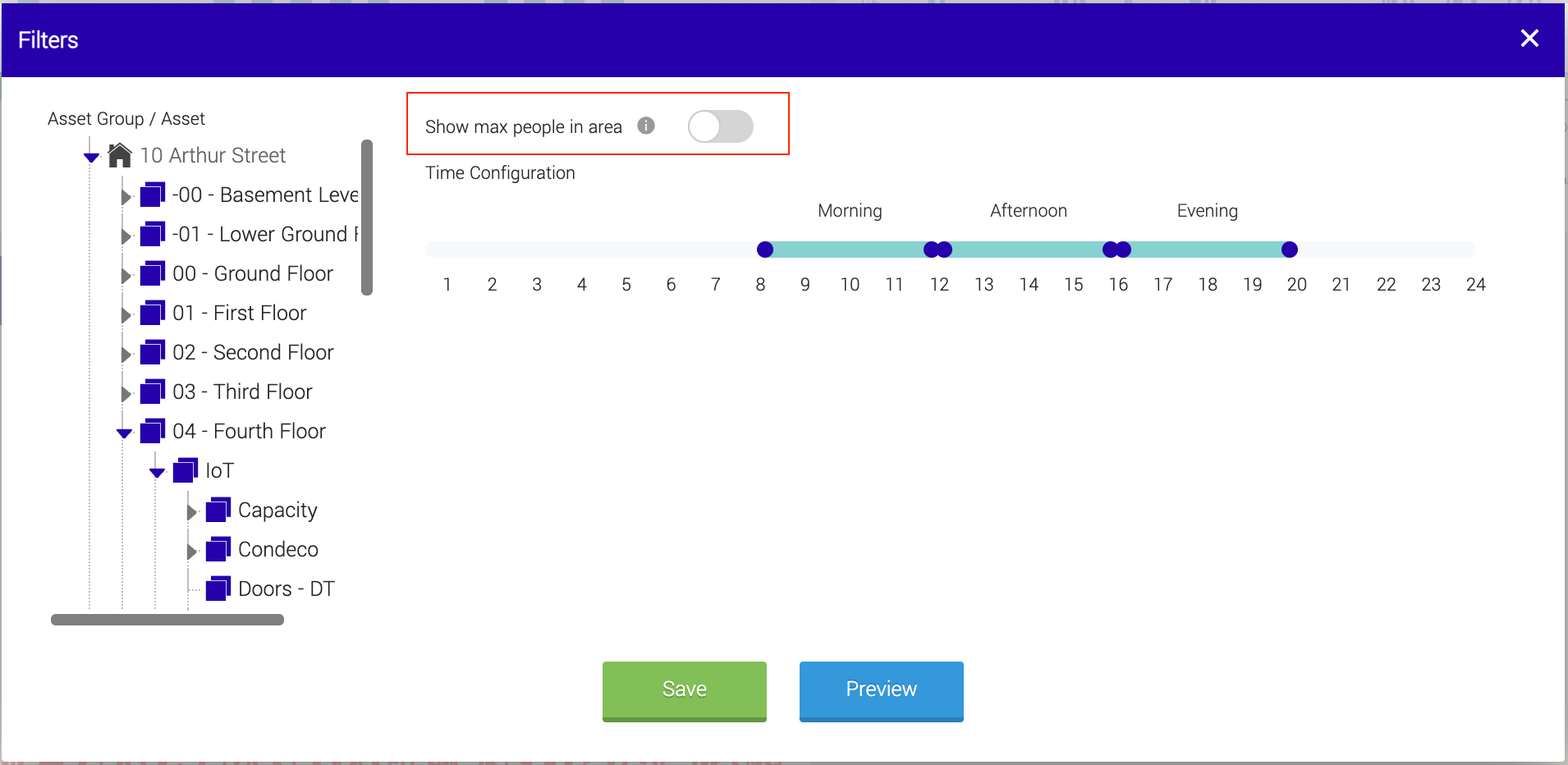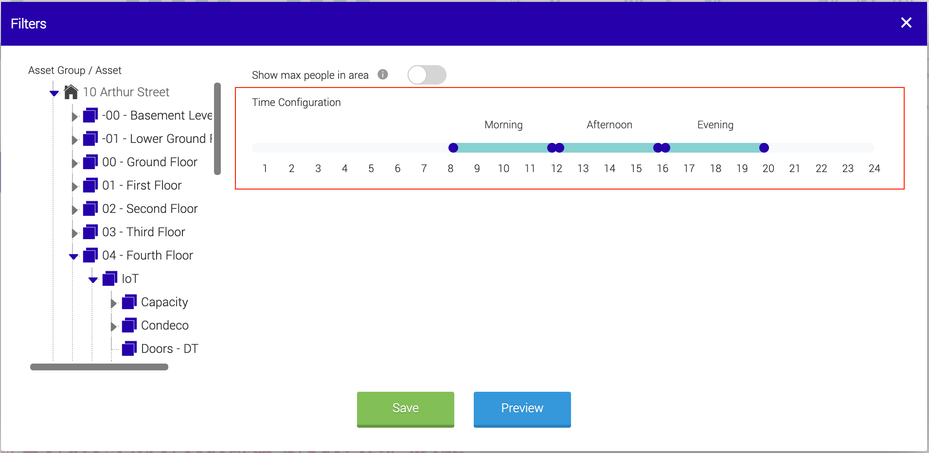 Once you have selected your asset groups, you can configure the time periods to be presented on the chart. There is a morning, afternoon, and evening slot. Click and drag each blue circle on the timeline to create the time window you want. You can choose 30-minute slots.