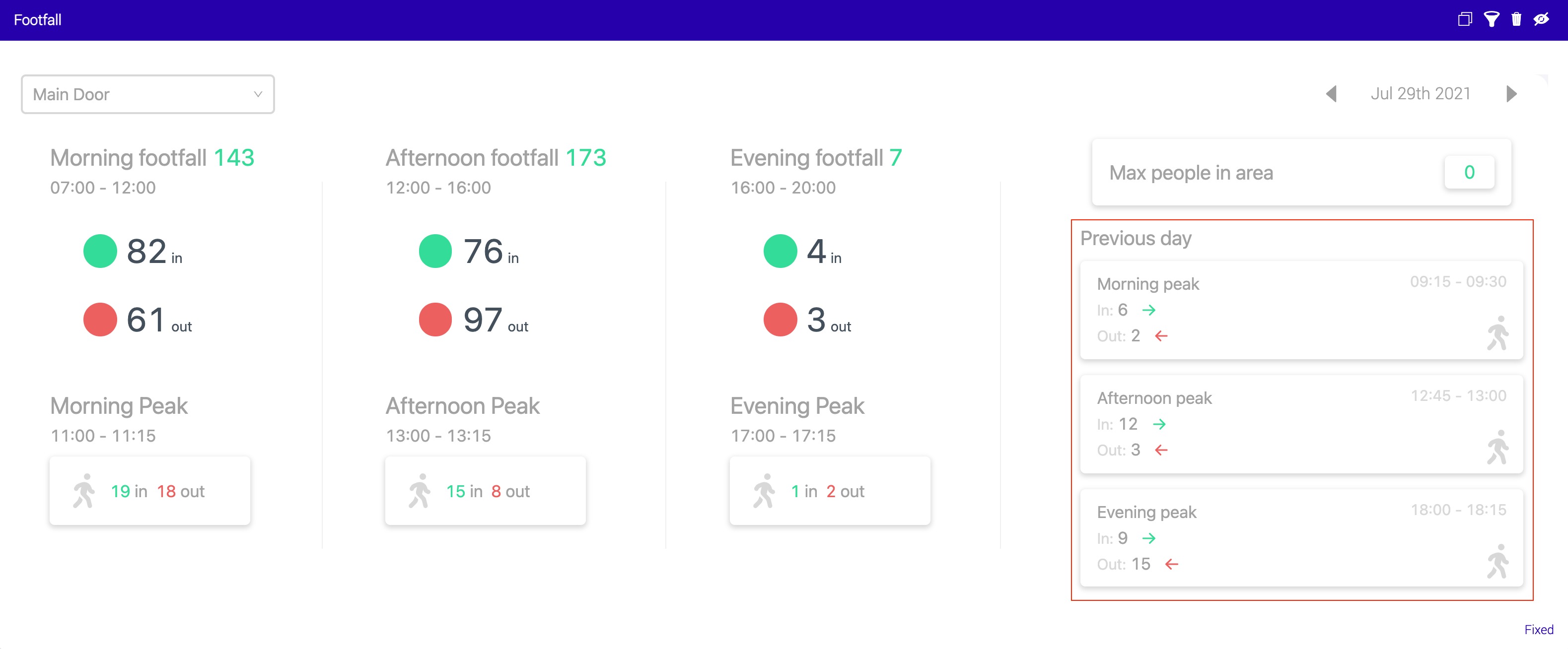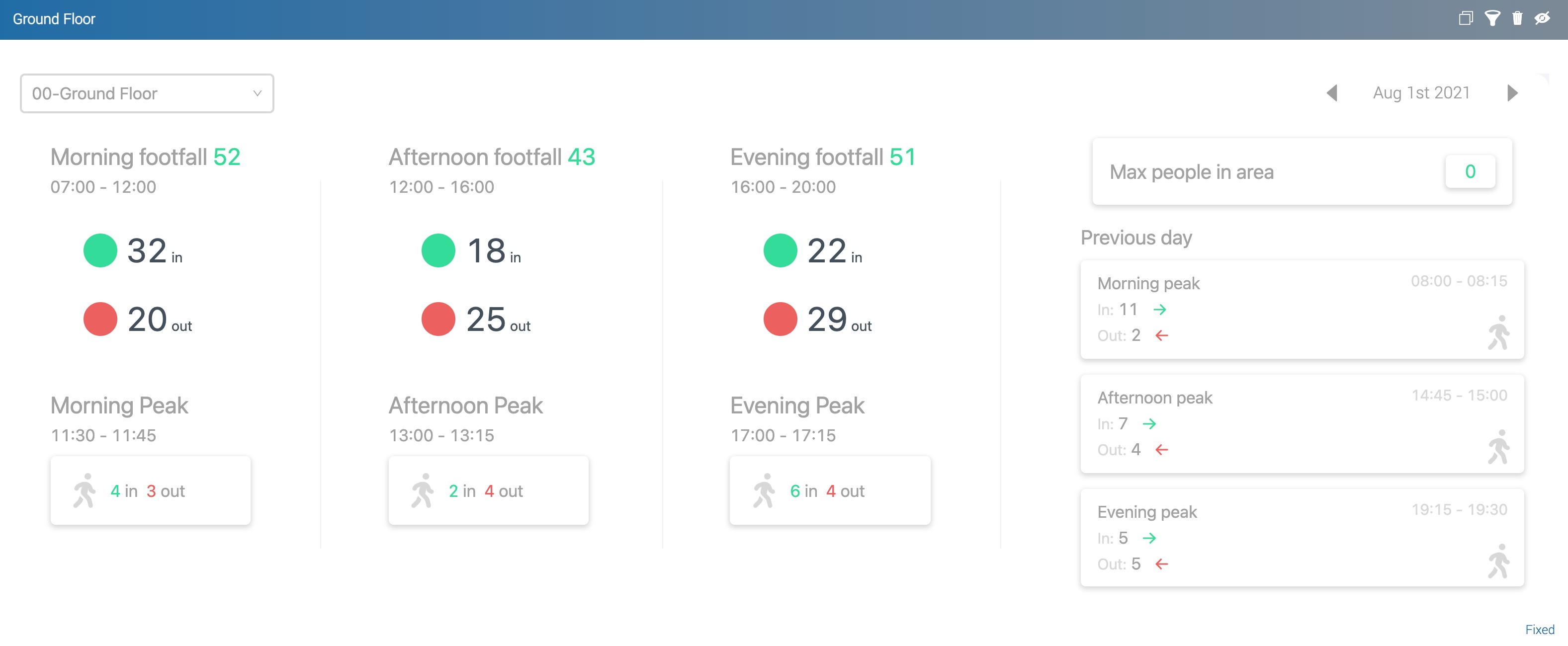The Footfall panel provides an overall count of people entering and out of the space, detailed by the number next to the title. In addition, you also get an in and out count to view the general flow into (or out of) the area.
