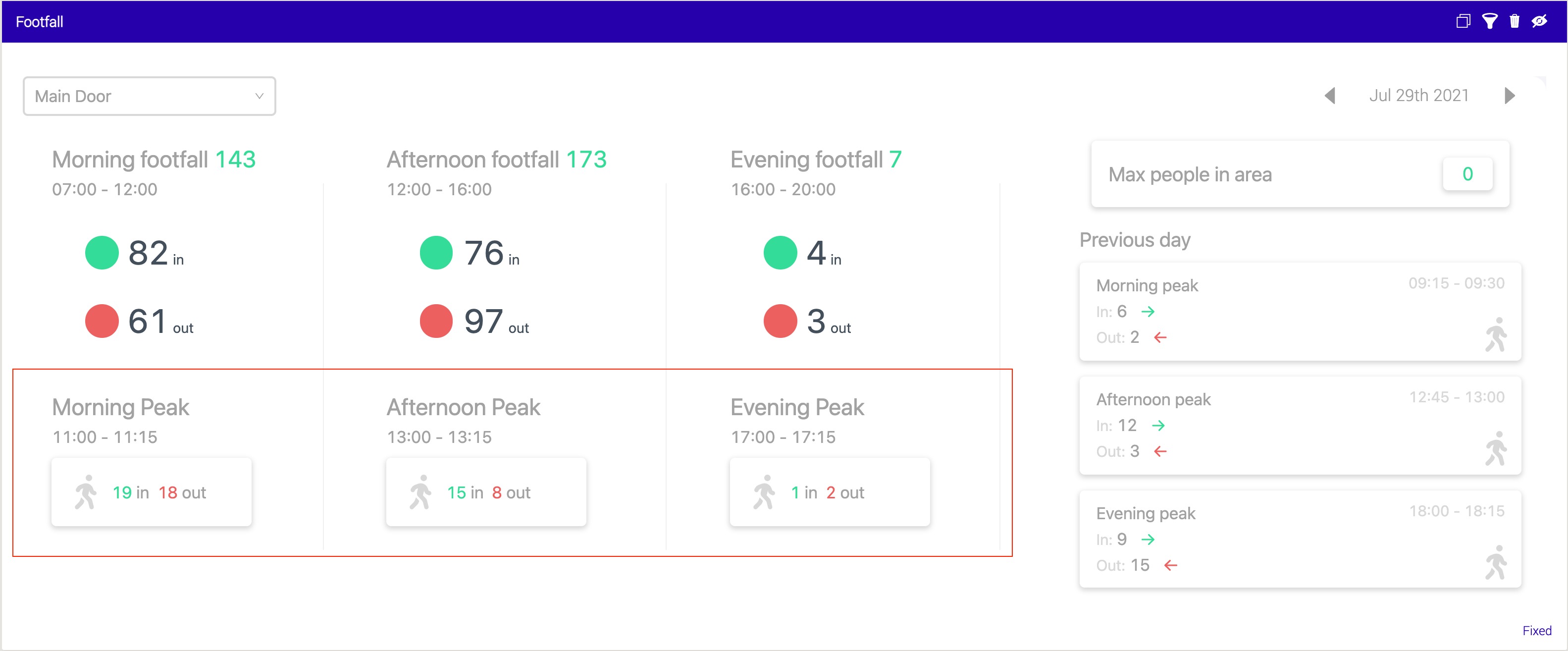 Each of the time boxes has an associated peak time. The peak time is the highest overall flow of people in and out of the area. For example, on the below panel, there were 37 entrances and exits during 11:00 and 11:15.